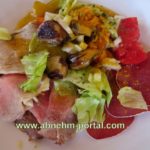 Für das Dressing 3 EL Olivenöl, 2 EL Obstessig, 2 EL Wasser, 1 TL Senf, Kräutersalz,