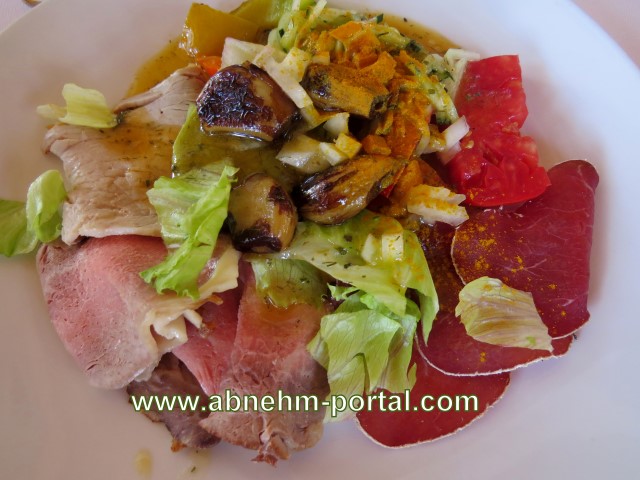 Die Salate auf zwei Tellern anrichten, die Sauce über den Salat geben. Zwiebel, Knoblauch dazugeben. Je 3 Scheiben Roastbeef und rohen Rinderschinken dazu servieren. Mit Kurkuma bestreuen.