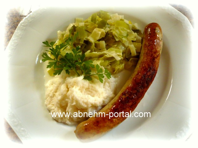 Lauchgemüse mit Rettichsalat und Bratwurst