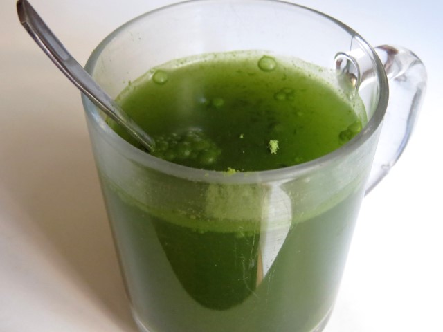 Es schmeckt so ein bisschen nach Spinat, ist aber gut zu trinken. Zudem sättigt es auch ein bisschen und man kann es praktisch als kleinen Zwischensnack nehmen.