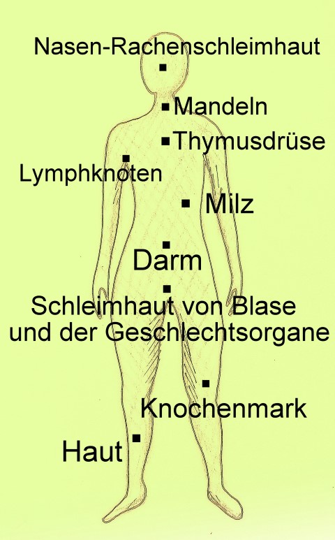 Die Lymphknoten und Lymphbahnen sind Sammelstellen und Transportwege für Abwehrzellen. Die Milz speichert Abwehrzellen. Auch das Knochenmark, die Thymusdrüse und die Mandeln, sind ebenfalls an der Abwehr beteiligt.